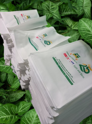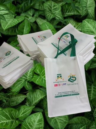 Ini salah contoh pesanan tas dari multazam tour tas bahan spunbond warna putih sablon 1 muka banyak warna.
